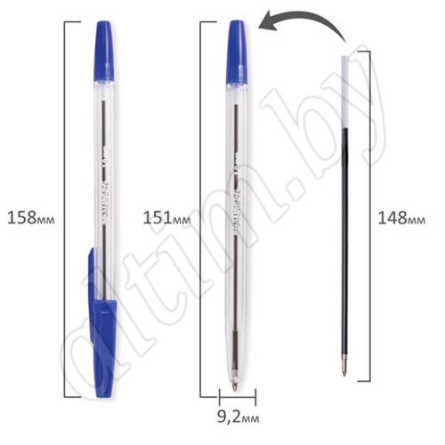 Диаметр пишущего узла, равный 1 мм, создает среднюю по толщине линию письма, равную 0,5 мм. Цвет чернил - синий.