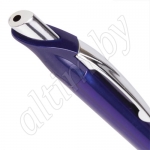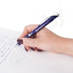 Имеет круглый корпус синего цвета с печатью и резиновым грипом в зоне захвата для удобства письма.
