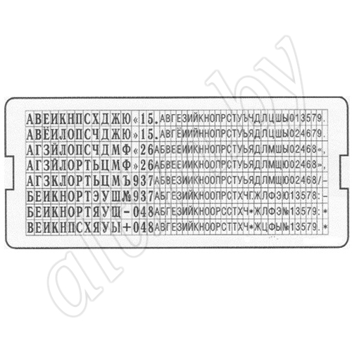 Размер клише: 47×18 мм. Касса: 6005, 6006 (латинский вариант 6003, 6004) символов.