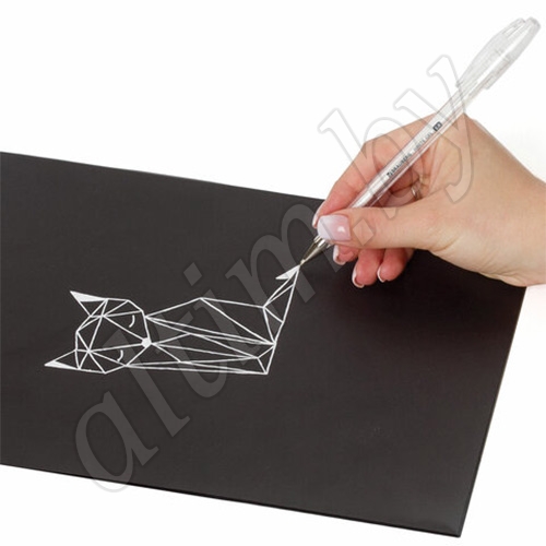 Диаметр пишущего узла 1 мм создает тонкую линию письма, равную 0,5 мм. Белые чернила равномерно распределяются на бумаге.
